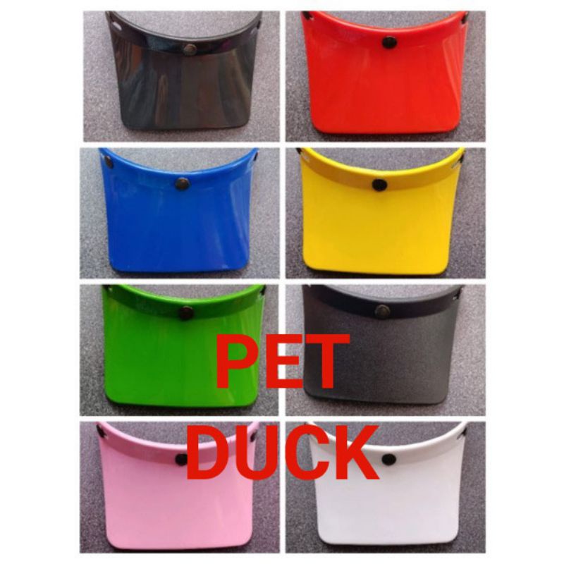 Produk ini memiliki 8 Variasi VARIASI PET yaitu : PET DUCK KUNING,PET DUCK MERAH,PET DUCK HITAM,PET DUCK HIJAU,PET PENDEK HITAM,HELM SAJA,KACA FLAT CLEAR,KACA FLAT HITAM,