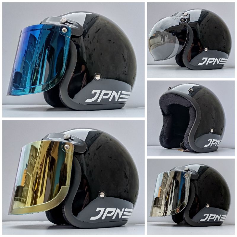 Helm Bogo Retro JPN Black Hitam Glossy/Metalik Satu Set kaca Datar Cembung-Helm Bogo jpn Original Retro Classic